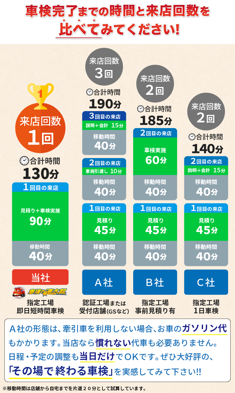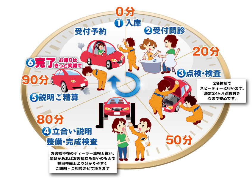 ※整備内容によっては、車検が90分で完了しない場合もございますので、予めご了承くださいませ
