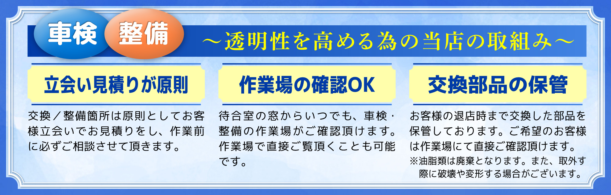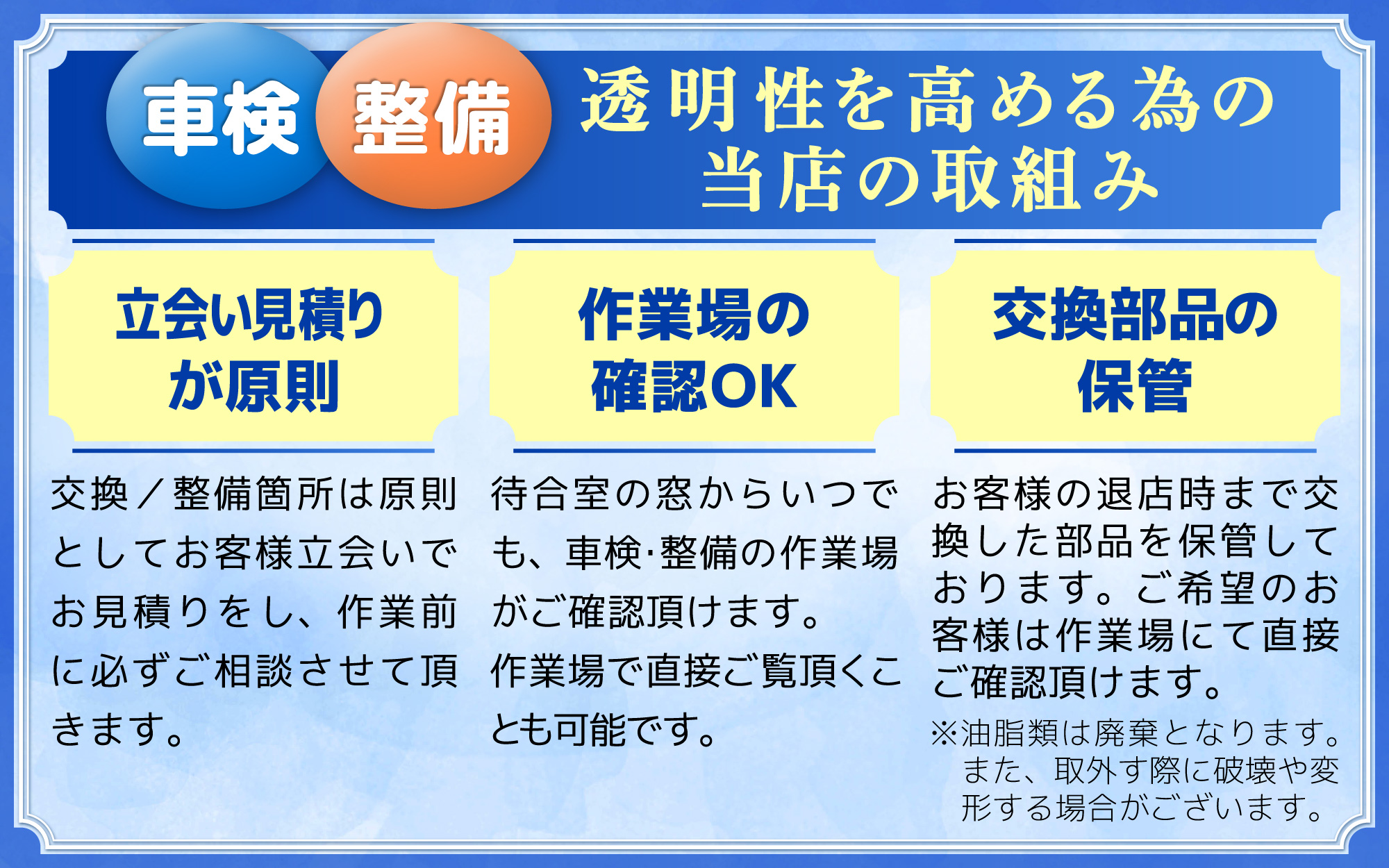 後日書面と口頭だけで整備項目や請求金額が伝えられるディーラー整備等と異なり、整備が必要な箇所をその場で実際にご確認頂けるため、「整備が必要な項目の納得がしやすい」・「金額の透明性が高い」と多くのお客様にご支持頂いております。